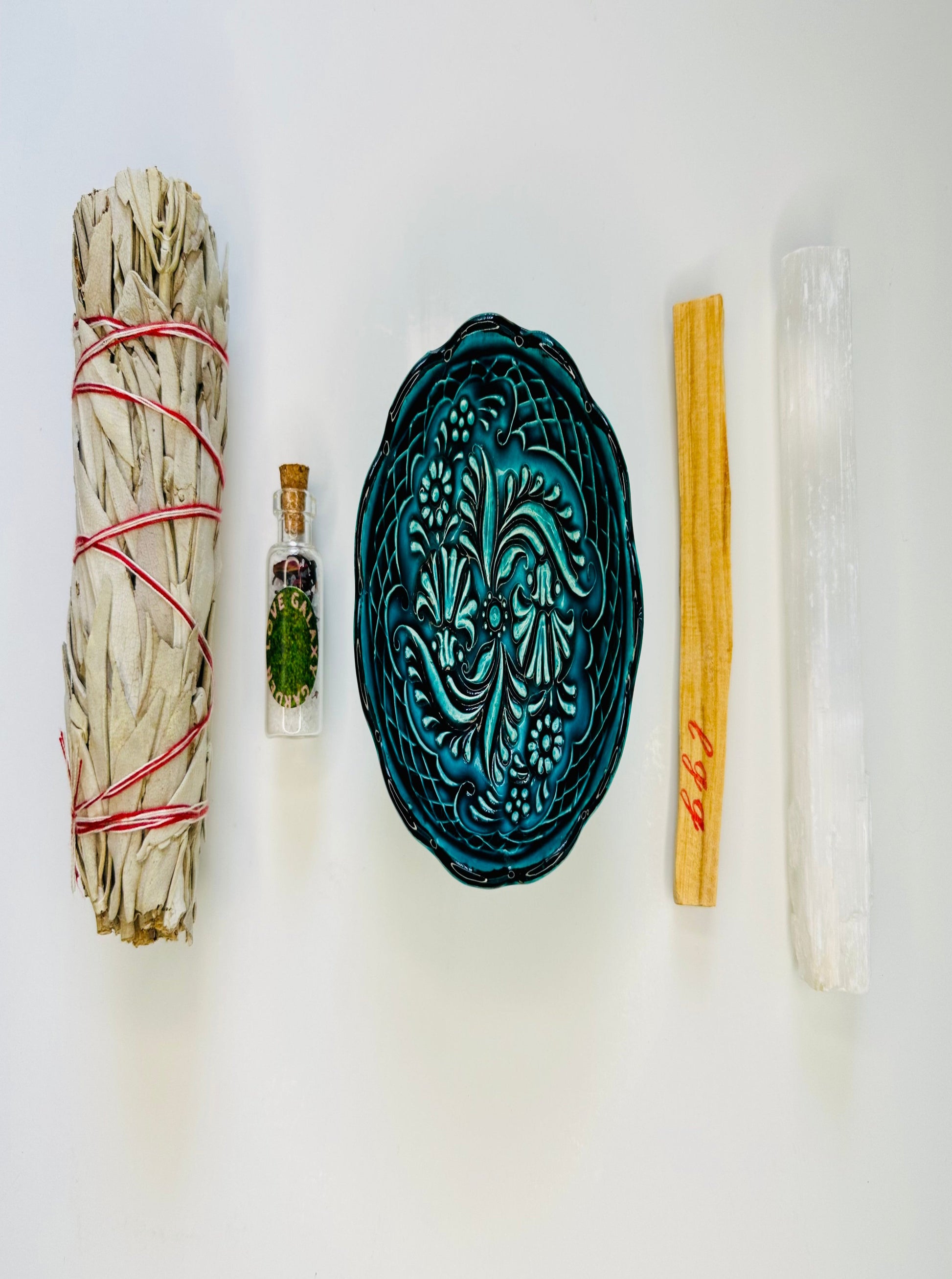 1 Palo Santo Stick, 1 Sage, 1 Smudging Bowl, 1 Love Salt, 1 Selenite Wand (optional)